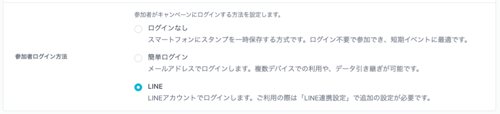 キャンペーン設定のシステム設定セクションの「参加者ログイン方法」項目で「LINE」を選択して保存してください。サイドバーに「LINE連携設定」メニューが表示されます。